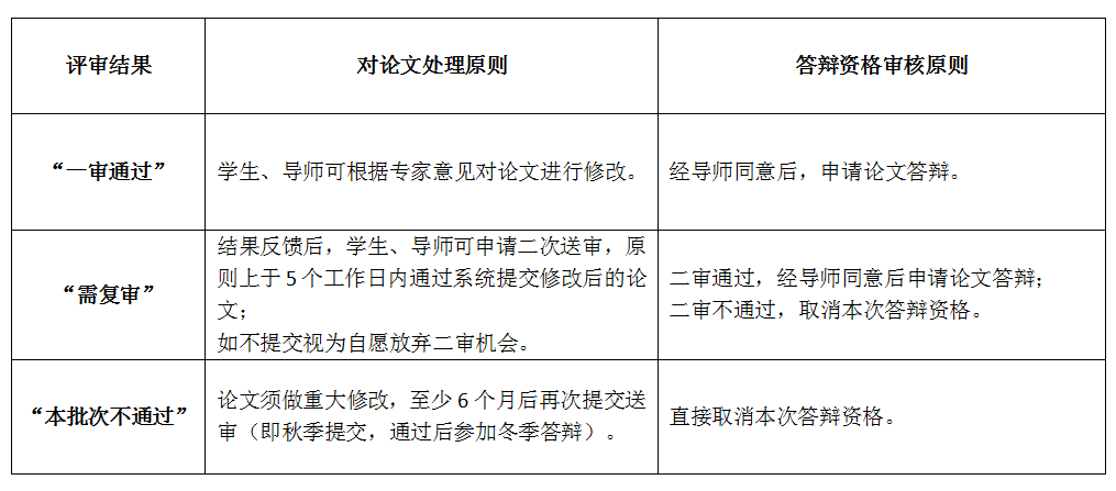 通过系统陆续反馈。学生、导师和二级单位管理人员均可登录系统查看,论文评阅书可自行下载。论文评审结果原则上按如下办法处理: