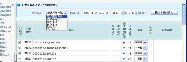 5)             在图二窗口的“选择”列中,选择参加考试班级。最后点击“确定考试时间”按扭,完成课程考试时间的申请。