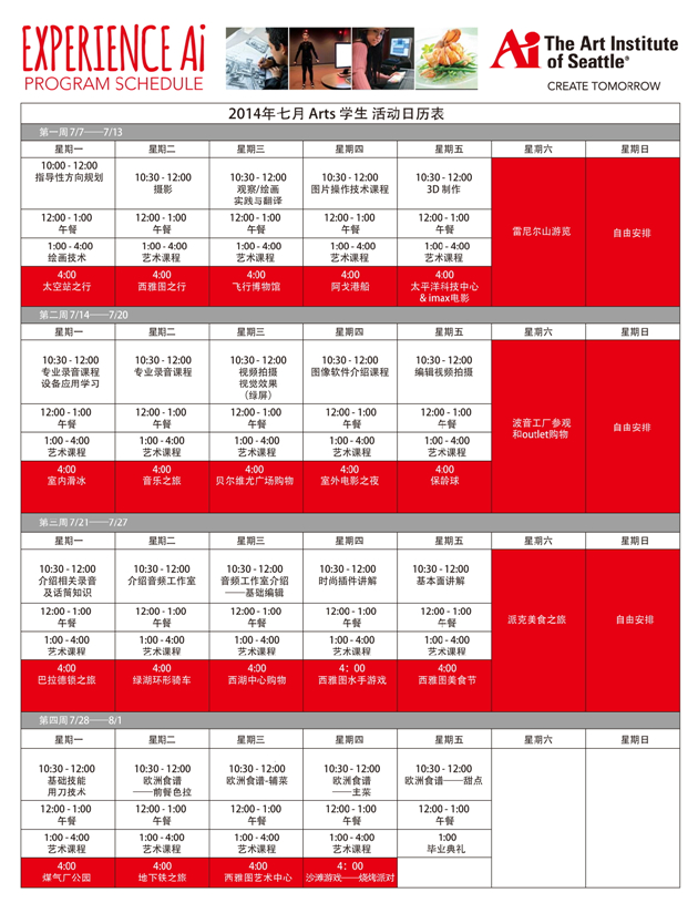 美国艺术大学4周暑期体验营开始招生,地点在西雅图、华盛顿,课程及活动安排详见附件。有意向的同学请关注,也可至辅导员处领取海报做进一步了解。报名截止时间为5月19日。