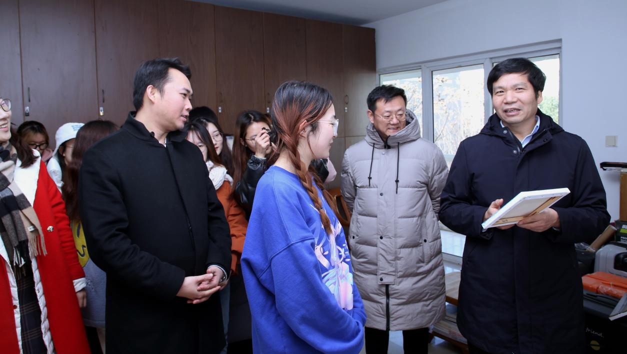 2020年12月31日上午,校党委书记郑永安走进艺术学院学生宿舍,亲切关心学生学习与生活,送上暖心祝福与礼物。将军路校区管委会、学生处、艺术学院等部门领导随同参加了慰问活动。