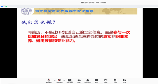 5月29日,艺术学院开展了职业素质训练营第二讲:大学生求职简历制作。本次讲座延续了5月24日学院召开的就业工作动员会的主旨,学院邀请南航就业创业指导服务中心张月铭老师,为学院的应届毕业生简历的准备进行了专业的指导。