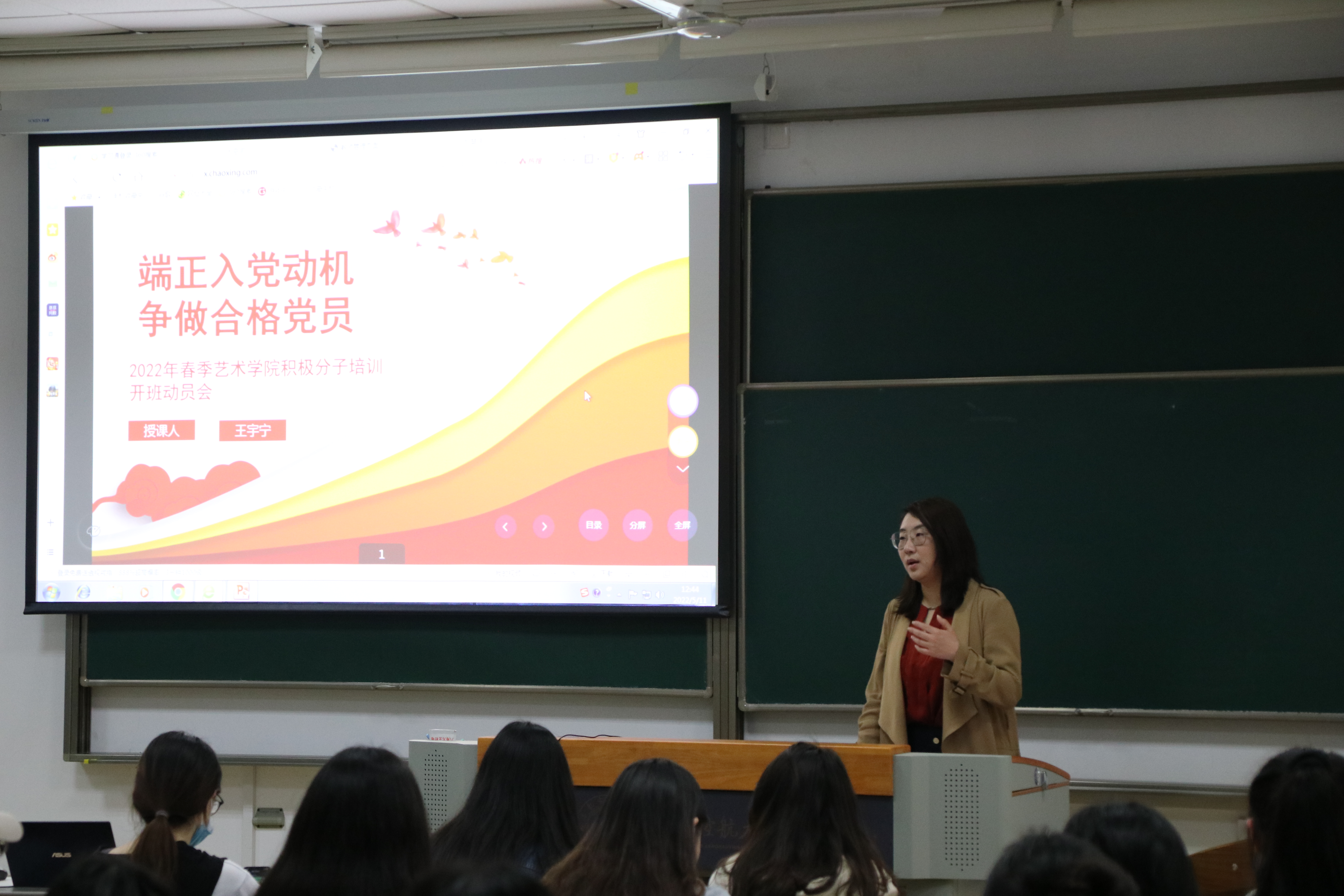 根据学校党校培训的安排部署及学院实际,5月11日中午,艺术学院举行了2022年度积极分子培训开班动员会。学院党委副书记王宇宁以“端正入党动机,争做合格党员”为主题,为入党积极分子讲授入党第一课。学院组织员孙吟吟老师、艺术学院2022年度春季入党积极分子参加了此次动员大会。