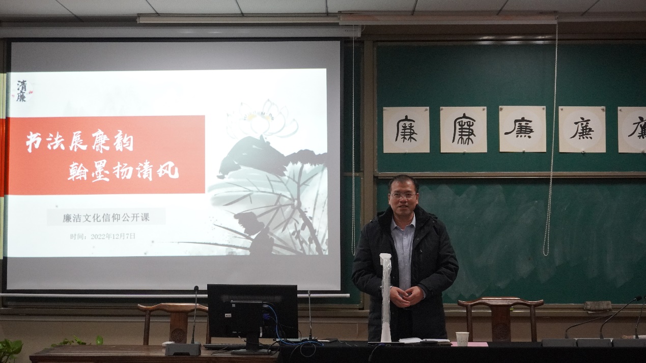 12月7日上午,由经济与管理学院团委、艺术学院团委共同承办的“书法展廉韵,翰墨扬清风”信仰公开课在艺术学院砚湖书院举行。本次公开课由南京书房创始人、江东书画院院长张星星担任授课嘉宾,校财务处处长张丕宏,经济与管理学院党委书记苏州,艺术学院党委书记张钟勤,经济与管理学院党委副书记胡苹、副院长邓晶,艺术学院党委副书记王宇宁、副院长马道全,两学院专兼职辅导员,学生会、研究生会主席团以及学生党支部纪检委员等50余