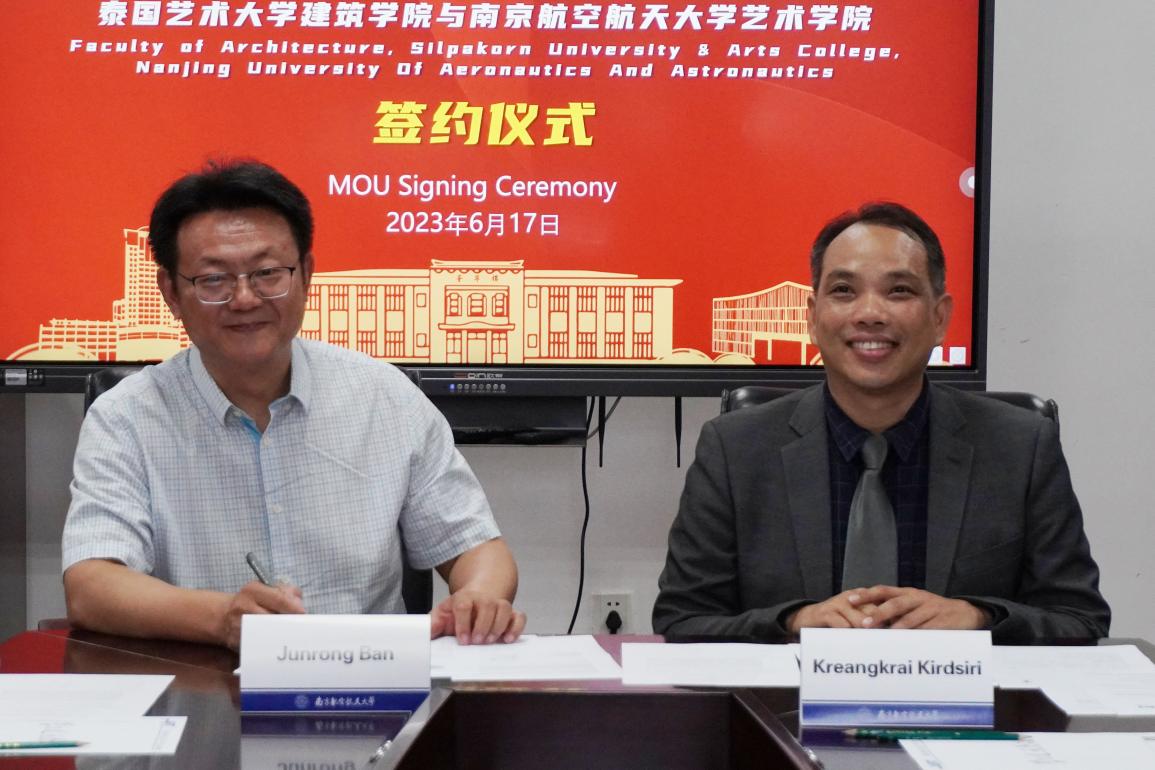 6月17日上午,泰国艺术大学建筑学院与南京航空航天大学艺术学院举行了签约仪式。泰国艺术大学建筑学院副院长 Kreangkrai Kirdsiri 、南京航空航天大学艺术学院院长板俊荣共同签署了合作谅解备忘录。决定以此为契机,推动建立双方在教育、研究以及其他学术交流项目领域的合作关系,开展师生互访及项目合作。与会人员还围绕未来的合作意向进行了进一步的交流研讨。
