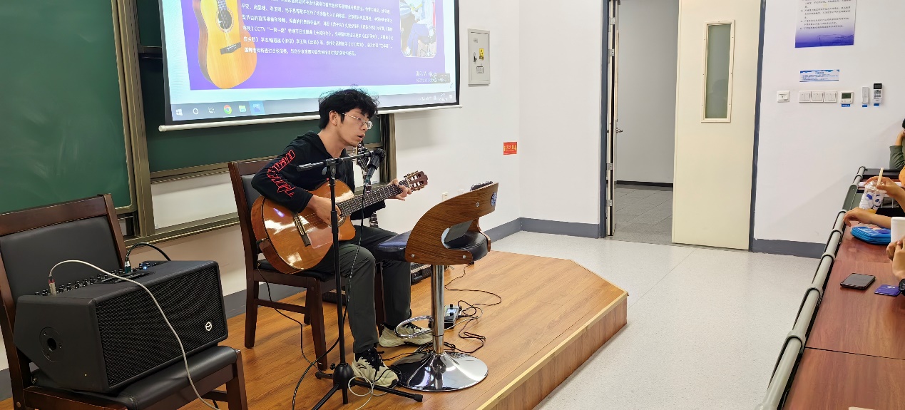 互动活动开始,湛辉为同学们弹奏了《爱的罗曼史》《加州旅馆》等经典吉他曲,接着他讲解了吉他学习的基本要领,之后他还邀请几位同学进行现场弹唱,并鼓励同学们在弹唱的时候要自信,大胆表现。
