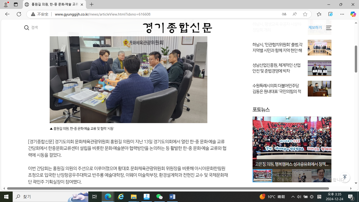 12月13日,代表团与韩国京畿道议会文化体育观光委员会举行了座谈会。此次座谈会由京畿道议会议员洪元吉组织,京畿道议会文化体育观光委员会委员长黄大浩议员亦出席并发表了充满热情的演讲。黄大浩议员对南航艺术学院代表团的到来表示了诚挚的欢迎,并特别强调了中韩交流在京畿道知事金东渊(省级行政区首长)的政策规划中所占据的核心地位。他指出,目前京畿道正将中韩交流作为工作重点,并致力于在经贸、科技、教育、环境、健康、农业、观光等多个领域深化两国合作。黄大浩议员还明确表态,将与京畿道及其议会国际交流相关部门携手,积极探讨合作事宜,为双方合作项目提供全面的支持与保障,共同促进中韩文化交流合作的实质性发展。