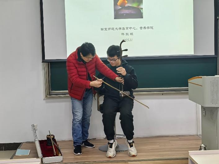 “国乐不仅是艺术形式,更是中华文明的精神载体。”11月25日晚,南京师范大学美育中心主任、音乐学院林东坡教授做客我校,为百余名学子带来一场别开生面的美育讲座《国乐的奥秘》。这不仅是知识的讲解,更是一场沉浸式的国乐体验,当天还有个别同学参与了现场互动,随林教授学习了二胡的基本演奏技巧。