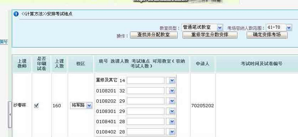 7)              对于上课人数太多或重修生需单独安排考试地点的,请点击“重修学生分散安排”,后,再点击“查找并分配原则教室”。