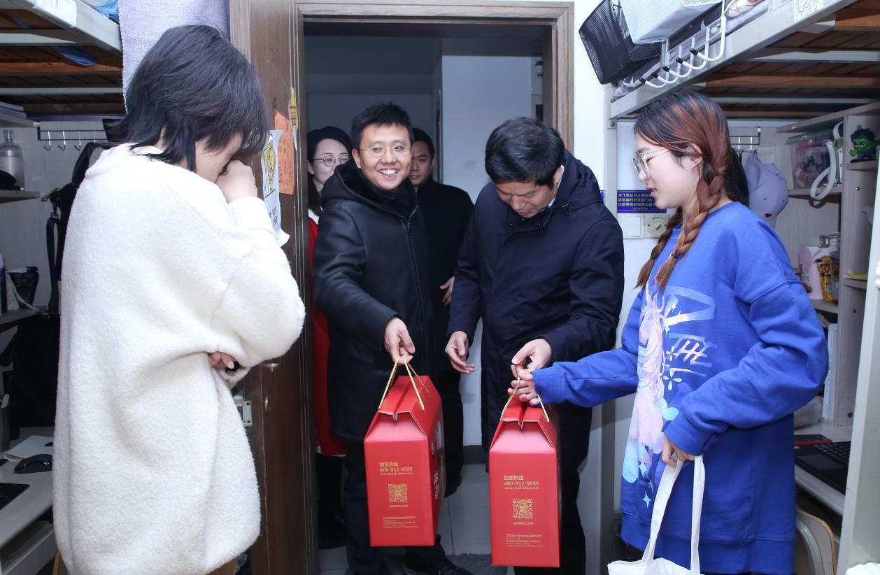 2020年12月31日上午,校党委书记郑永安走进艺术学院学生宿舍,亲切关心学生学习与生活,送上暖心祝福与礼物。将军路校区管委会、学生处、艺术学院等部门领导随同参加了慰问活动。