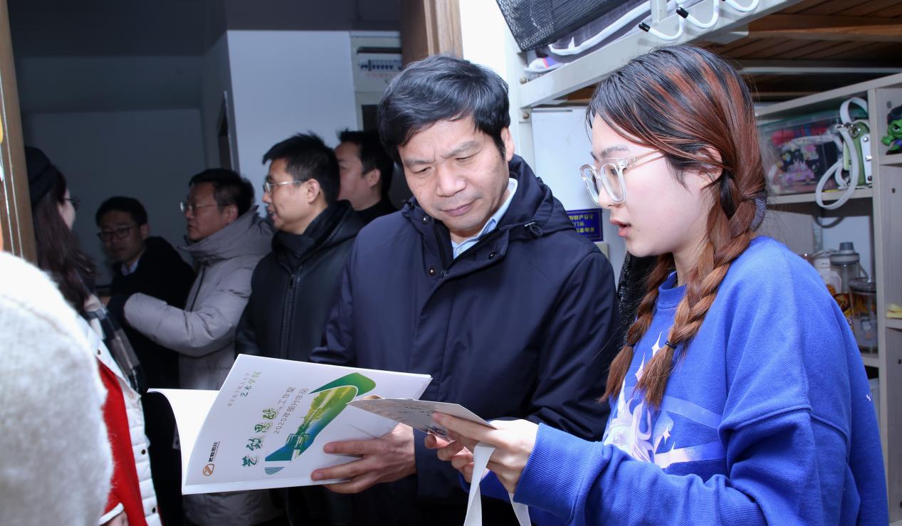 “新年好!”郑永安一行来到东区25栋学生宿舍给艺术学院学生送上新年祝福与惊喜大礼包。“最近降温要注意保暖”“临近期末,大家复习怎么样?”“寒假有什么安排?”郑永安关切地询问她们近期的学习和生活状态。“我已经买好回家的票了,”一位来自湖北武汉的同学答道,“现在武汉很安全,希望跟家人开开心心过个安心年。”了解到同学们的近况后,郑永安十分欣慰,并再一次强调面对当下疫情每一个人都不能放松警惕,放假返乡途中要注意个人防护,保护自身安全。