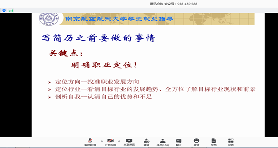 首先,张月铭老师给同学们介绍了当前的就业形势,从招聘时间节点说起,应届生自9月开学即将进入秋招,60%以上的用人单位集中在9—10月内集中组织校招,根据往年的经验来看,在找工作前期大部分同学都会面临受挫,这是正常现象,需要认真总结每次成功与失败的经验。受到疫情影响,今年的就业形势格外严峻,因此必须提早定目标,做出两个思考:是继续深造还是工作?你做好找工作的准备了吗?