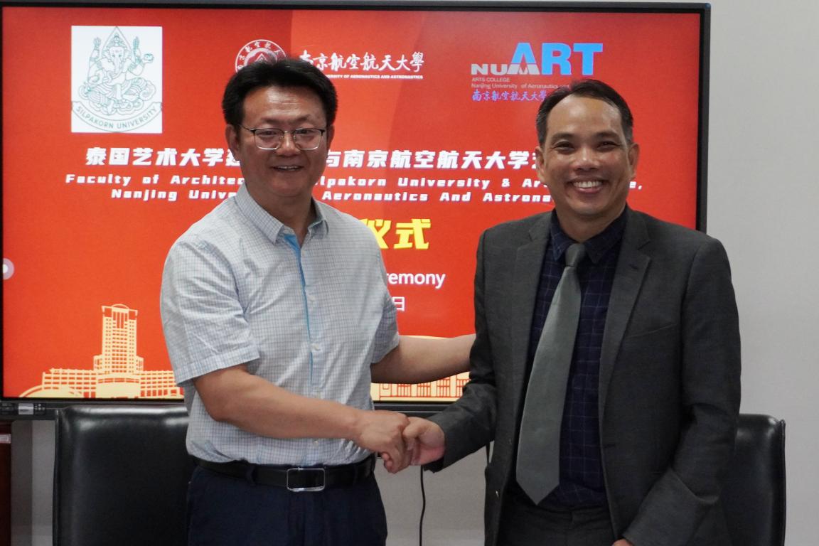 6月17日上午,泰国艺术大学建筑学院与南京航空航天大学艺术学院举行了签约仪式。泰国艺术大学建筑学院副院长 Kreangkrai Kirdsiri 、南京航空航天大学艺术学院院长板俊荣共同签署了合作谅解备忘录。决定以此为契机,推动建立双方在教育、研究以及其他学术交流项目领域的合作关系,开展师生互访及项目合作。与会人员还围绕未来的合作意向进行了进一步的交流研讨。