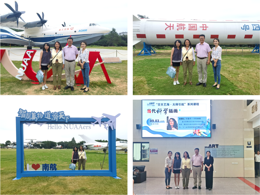 艺术学院板俊荣院长对卡特琳娜教授的来访表示热烈欢迎。邀请卡特琳娜教授一行参观了学校的御风园。校园自然风光与现代飞行器和谐地融合在一起,震撼而美丽。板院长向嘉宾介绍了战斗机、直升机等空天装备的入驻背景和功能特点,以及艺术学院师生在航空领域高科技制造中发挥的设计作用。卡特琳娜教授表示,参观御风园使她对于艺术和科技的融合应用产生了深刻的印象。