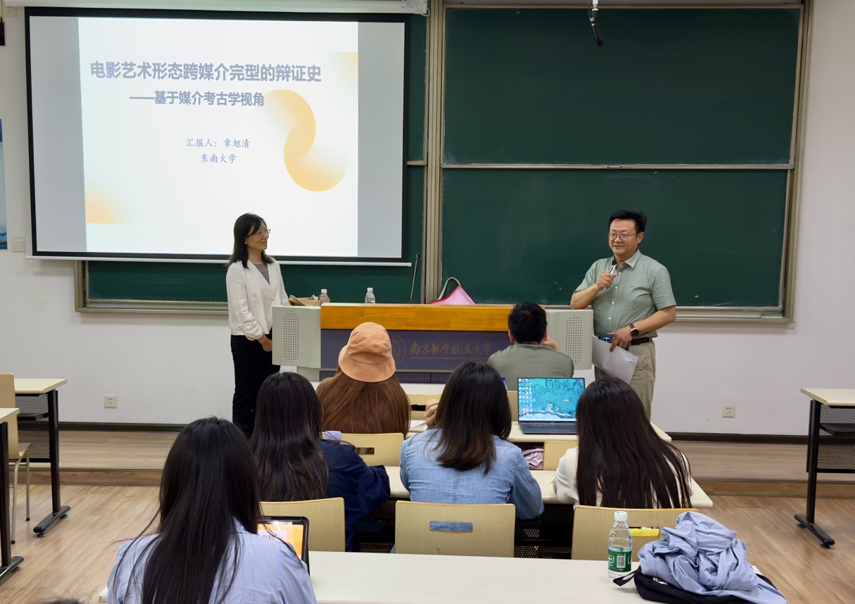 五月的江宁阳光明媚,微风和煦。29日下午,东南大学艺术学院博士生导师章旭清教授应我校艺术学院邀请,为师生带来一场“电影艺术形态跨媒介完型的辩证史——基于媒介考古学视角”的专题讲座。板俊荣教授主持了本次讲座,广播电视艺术学学科负责人罗良清教授担任对话专家,现场学术氛围浓厚,新闻传播系讲师马健、高娜及将军路校区四十余位同学共同出席本次活动。
