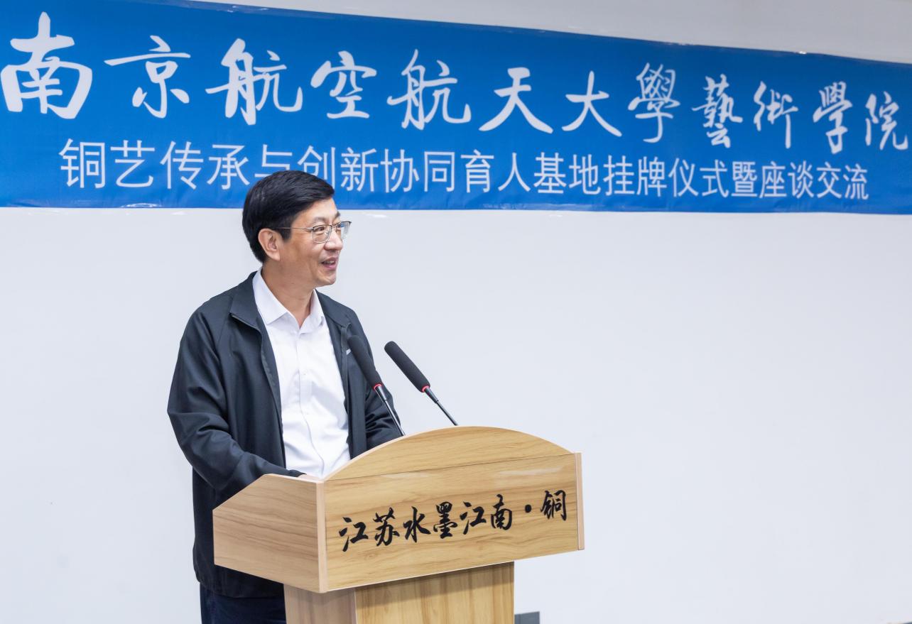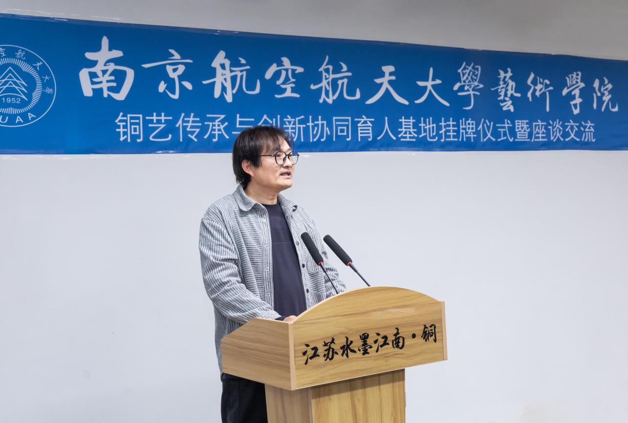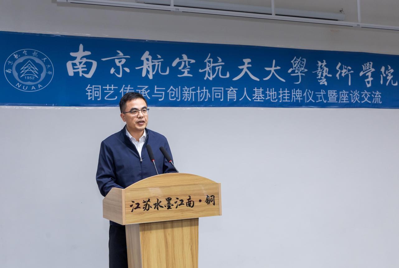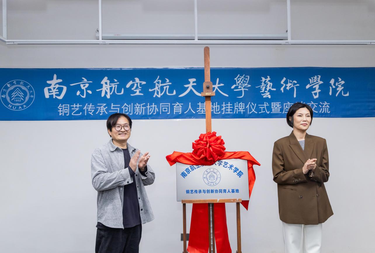 2025年10月30日下午,南京航空航天大学艺术学院与江苏水墨江南铜艺术馆在溧阳共同举行“铜艺传承与创新协同育人基地”挂牌仪式暨座谈交流会。溧阳市文联主席沈佳宾与古县街道党工委副书记、办事处主任管文彪、市民间文艺家协会、市美术家协会艺术家代表、江苏水墨江南园林景观工程有限公司董事长王光超、江苏水墨江南设计总监、常州大学硕士生导师朱惠娟、艺术学院领导班子参加会议。