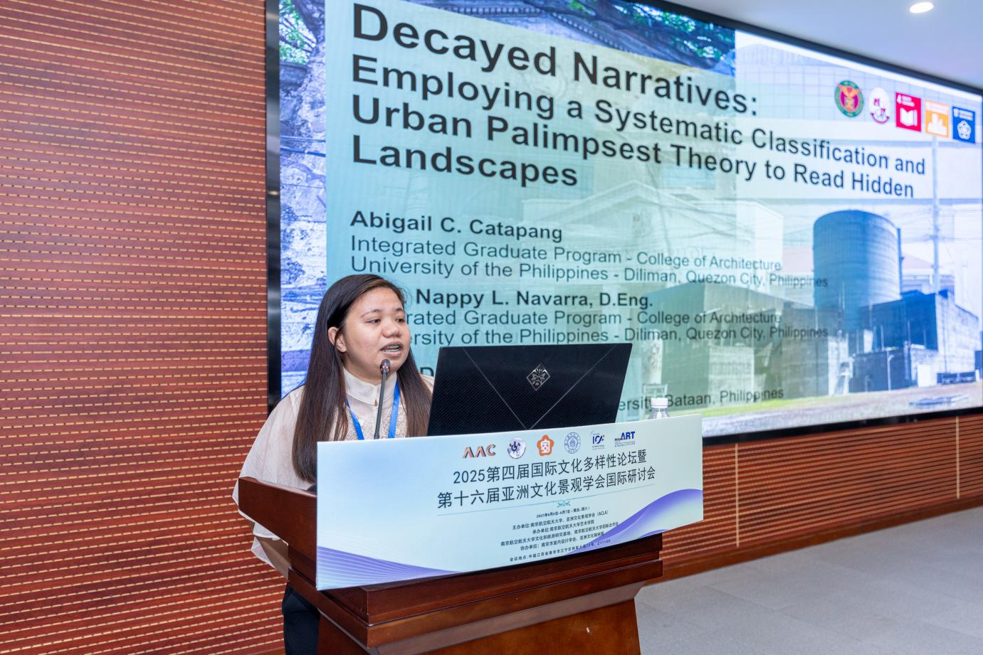 在下午的第二场会议中,亚洲文化景观学会副主席Ray March Syahadat先生从传统服饰与文化认同角度发表演讲;南京航空航天大学艺术学院讲师赵罗曼博士分享了其在食物景观与包容性食物规划方面的研究成果,为本次国际会议增添了地方实践的独特视角;加图立大学讲师Jeon Hyun Jeong博士从“音乐对文化景观的影响”切入,呈现了跨媒介的文化景观构建路径;菲律宾大学博士生Abigail Cruz-Catapang则以系统与叙事为方法,解读了菲律宾城市中的“隐藏景观”。